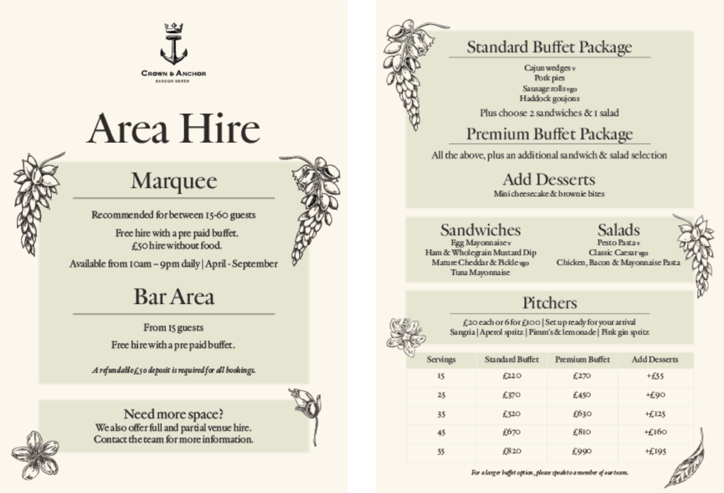 The Crown & Anchor’s unique spaces make it the perfect year-round event location. Throughout March to September, our private marquee area adjacent to the beer garden is perfect for any christenings, baby showers, birthdays, weddings or any celebratory occasion. Alternatively, our snug areas in the bar are available all year round.